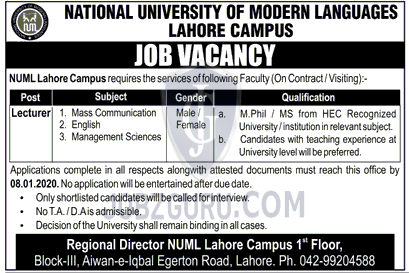 Today this page inform you the Lecturer Management Science. NUML University is looking to hire the calibre, hardworking and well-disciplined applicants for the following posts given.
